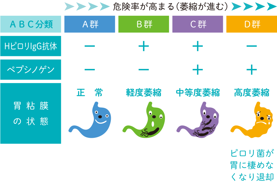 胃粘膜萎縮(老化)マーカーのペプシノゲンと胃潰瘍、十二指腸潰瘍の主な原因と考えられているヘリコバクターピロリIgG抗体を組み合わせて、胃の健康度をABCDの4群に分類するのがABC分類です。