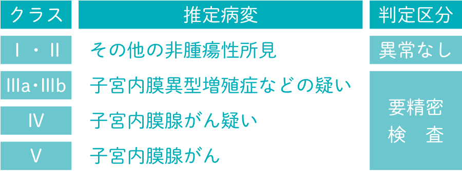 子宮体がんや子宮内膜増殖症の早期発見を目的としています。クラスⅠ・Ⅱ以外の場合は精密検査が必要です。